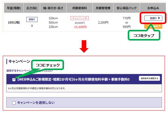 ハローストレージ物件詳細でキャンペーン内容を確認
