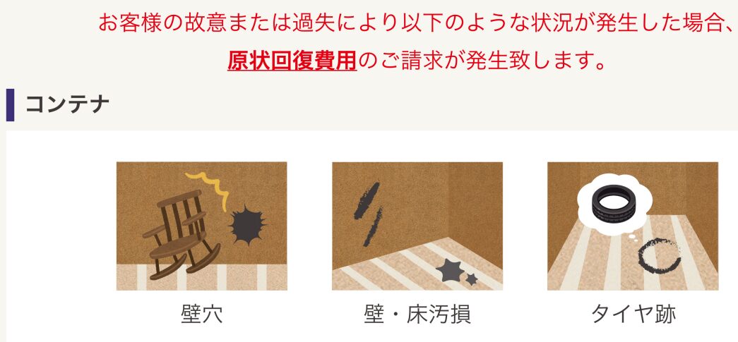 - 原状回復費用: 壁に穴を空けてしまったり、壁や床の汚損。・タイヤ跡等は、原状に戻す為の原状回復費用が別途請求されます。金額は公開されていませんが、「汚損や破損の程度により異なる」と書かれています。
